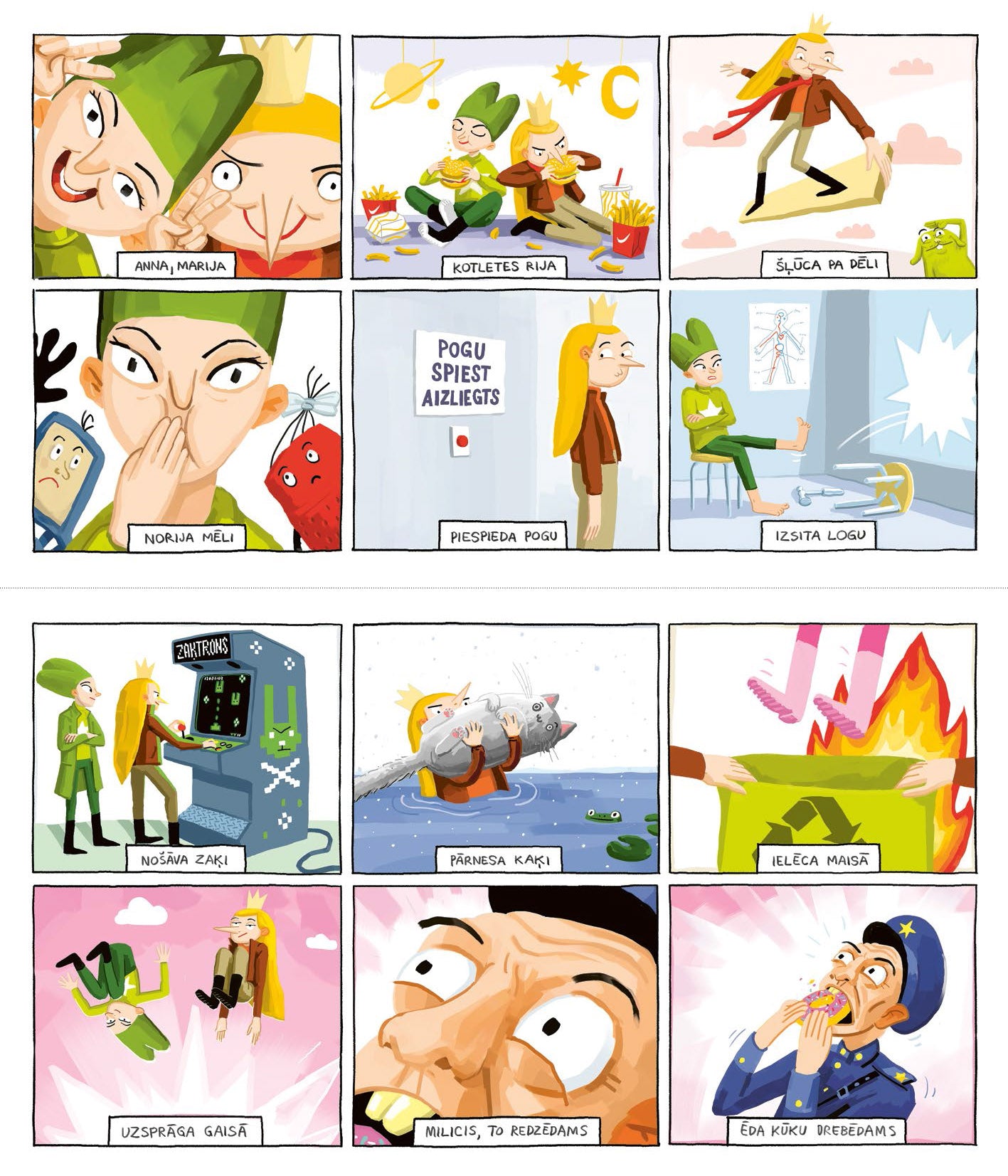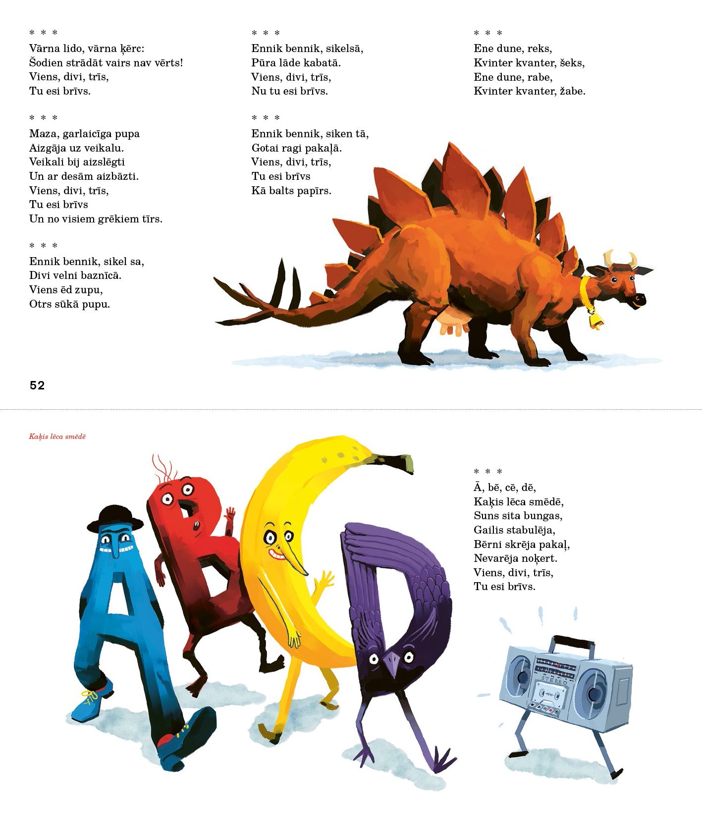 Bagātīgi un asprātīgi ilustrētajā grāmatā mākslinieks Reinis Pētersons vizualizējis pārgalvīgo un dauzonīgo skaitāmpantu garu, fantazējot tikpat brīvi, kā to darījušas daudzas bērnu paaudzes. Zīmējumos darbojas pārsteidzošie pantu personāži, no gardegunes Burbuļmātes un trakās kazas uz skrituļdēļa līdz pat slaucamam dinozauram un robotam-sūdzambībelei. Šīs ilustrācijas un pantu iedvesmotie komiksi padara mantoto folkloras bagātību viegli uztveramu un saistošu pat tiem bērniem, kuri vairs neprot no galvas skaitāmpantus un nepavada laiku ar draugiem pagalmā.