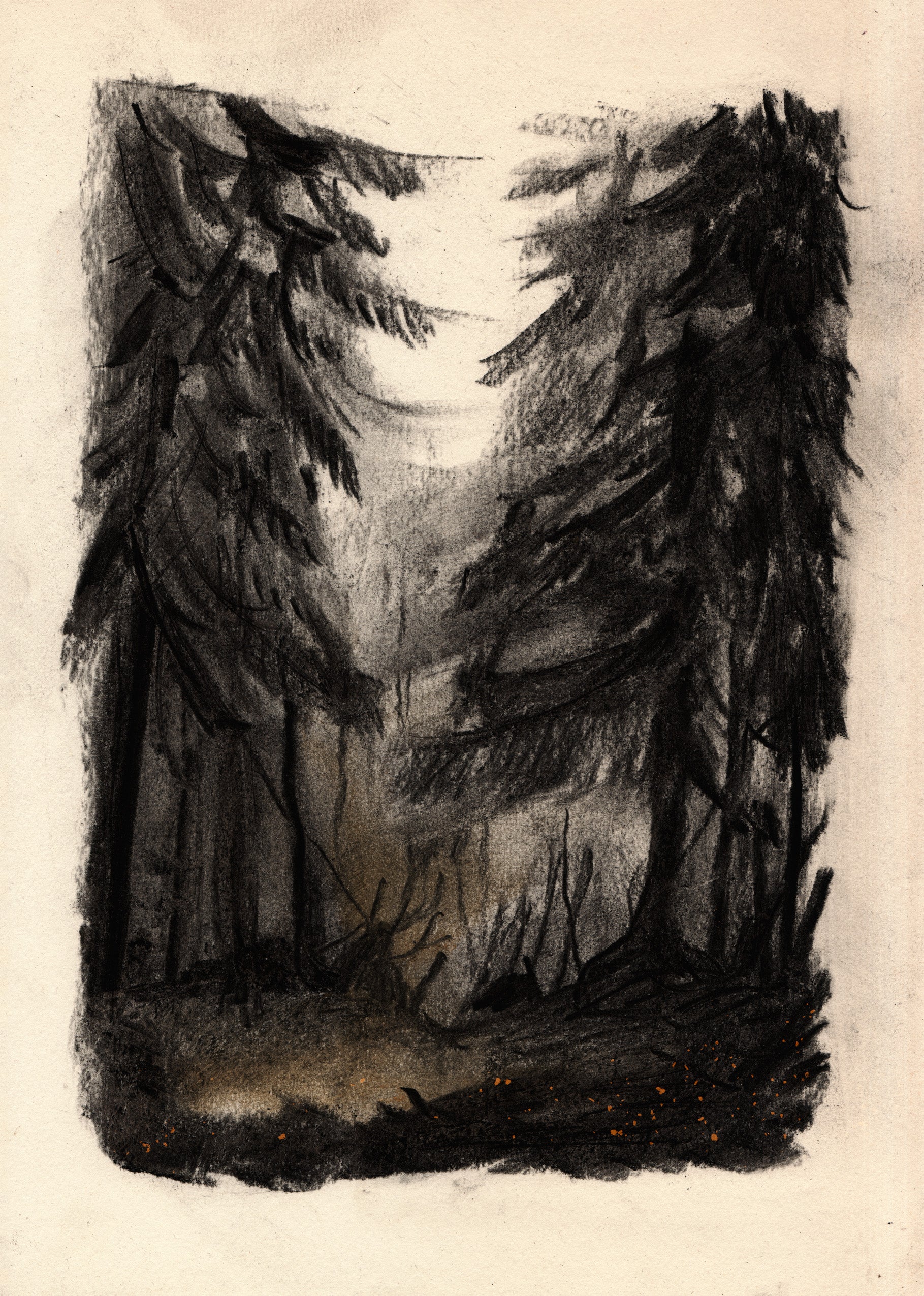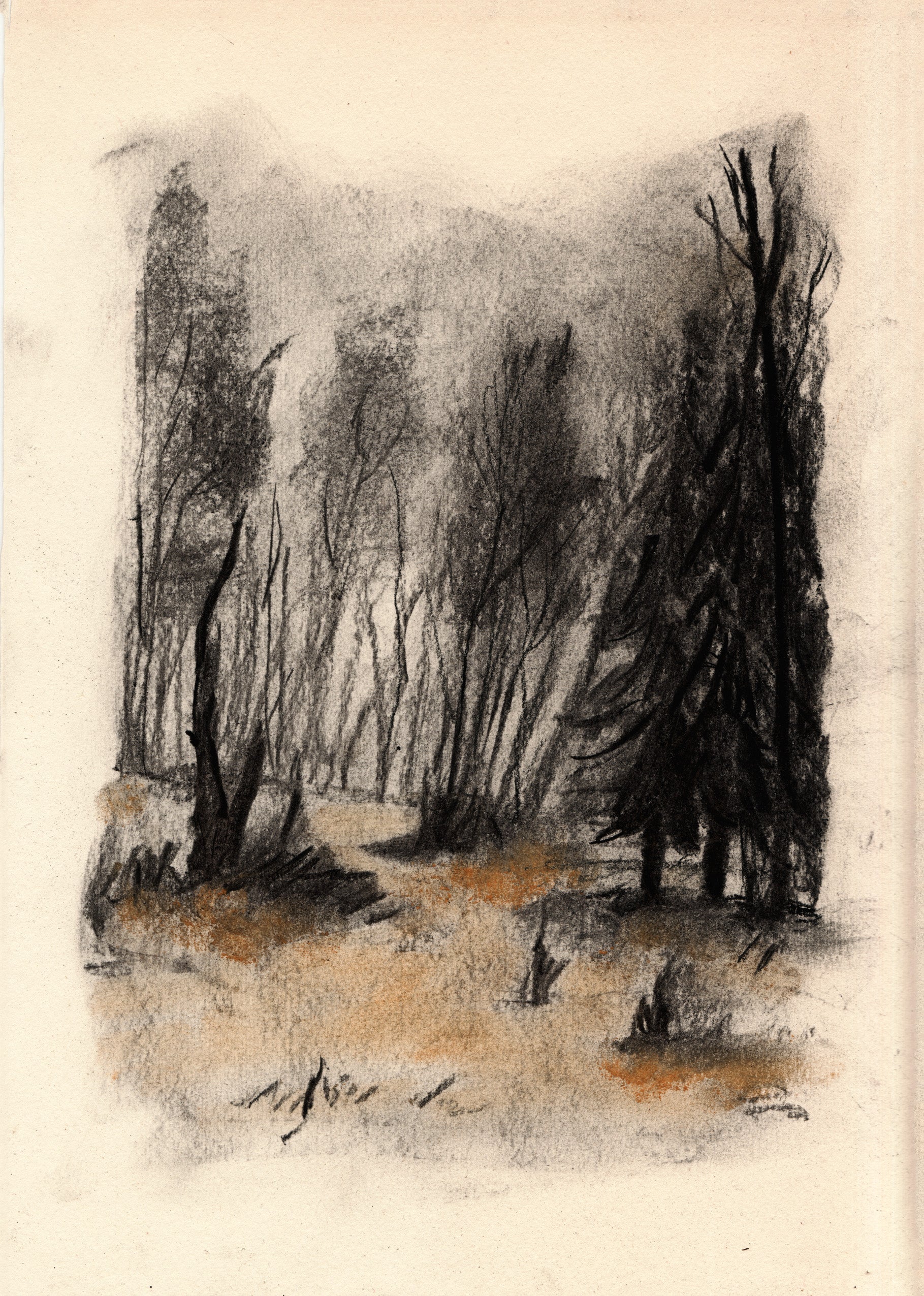 Reiņa Pētersona ilustrācijas uzbur Kurzemes meža noskaņas – brīžiem romantiskas, brīžiem skumjas, liekot domāt par mežā patvērušos cilvēku jūtām un arī par to aizmirstības mežu, kas mūsdienās jau klāj atmiņas par daudziem svarīgiem notikumiem.