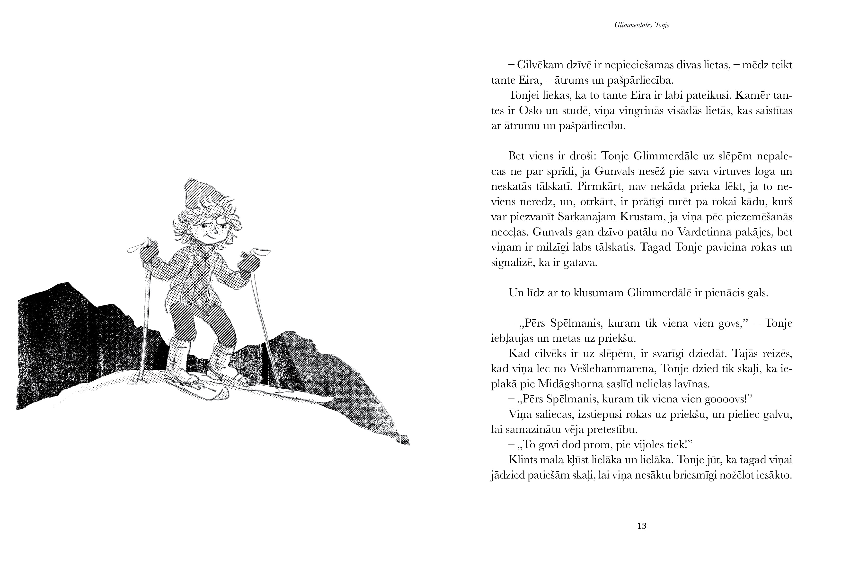 Grāmatas galvenā varone ir Tonje, zemnieku saimniecības iemītniece, kas draugos ar aitām, kazām un pieradinātu kaiju, vienīgais bērns nomaļajā, skaistajā Glimmerdāles ielejā. Tonjes moto, kas pārņemts no viņas tantēm – brašām slēpotājām, ir “ātrums un pašpārliecība”. Viņai patīk traukties no pakalniem ar slēpēm vai ragavām, dziedot pilnā rīklē, jo tad ir mazāk bail. Viņa ik dienu tiekas ar Gunvalu, kuram ir 74 gadi un kurš ir viņas kaimiņš, krusttēvs un labākais draugs, spēlē vijoli un ir lielisks pavārs. Viņam ir arī galdnieka darbnīca, kurā viņi meistaro kopā ar Tonji. Tomēr meitenei ļoti pietrūkst citu bērnu draudzības. Tonjei, kas vienmēr ir gatava riskēt un rīkoties, izdodas atrisināt ļoti grūtus savas un pieaugušo dzīves samežģījumus: viņa sadraudzējas ar sākotnēji visai agresīvu zēnu, kuru pametis tēvs, būvē jaunas attiecības starp veco Gunvalu un viņa pieaugušo meitu, kuri nav satikušies 30 gadus, panāk, lai Glimmerdāles kempingā tiktu atļauts apmesties ģimenēm ar bērniem. Tonje nebaidās smagos brīžos uzdot nepatīkamus, bet svarīgus jautājumus. Viņa arī atgādina Gunvalam pašu svarīgāko – ka pieaugušo izraisītos samežģījumos nekad nedrīkst vainot bērnu. Pateicoties Tonjes drosmei neklusēt un runāt to, ko liek sirds, Glimmerdālē atkal skan smiekli un vijole.
