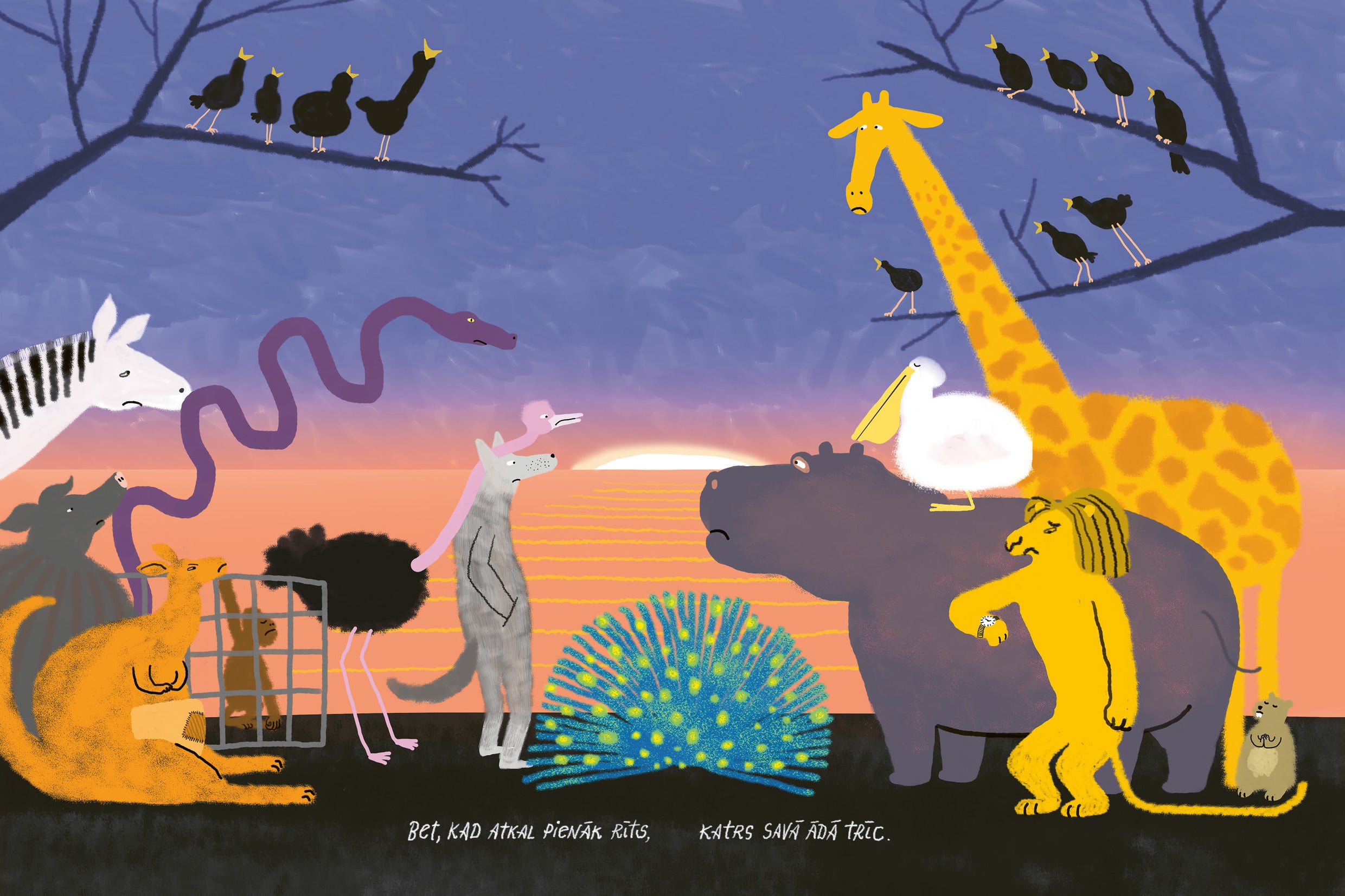 Bilžu grāmatas tekstu veido viens dzejolis, kurā drastiskās divrindēs tēlota zoodārza naktsdzīve. Priekšstats par “dzīvnieku karnevālu”, kurā cilvēki pārģērbušies par dzīvniekiem un mēģina tos atdarināt, te ir apvērsts pat ne otrādi, bet pavisam citādi – dzīvnieki paši pārģērbjas par citiem dzīvniekiem. Tēlot cilvēkus viņiem nemaz neinteresē, ja nu vienīgi tādus cilvēku pasaules tehniskos milžus kā ceļamkrāns un tramvajs. Vienīgais cilvēks šajā dzejolī ir aizmigušais sargs, kas no rīta, kad Zoodārzā iestājies miers un visi dzīvnieki atgriezušies savās ierastajās ādās un būros, turpina krākt – bet lauvas vēderā.