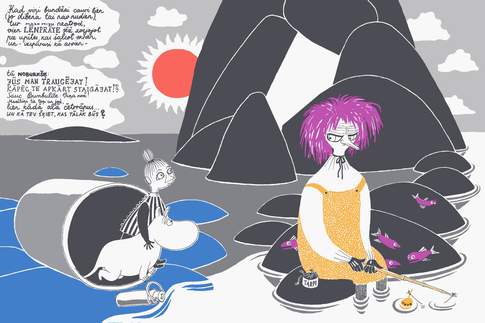 Tūves Jansones bilžu grāmata “Kas notika pēc tam?”, kas Somijā izdota 1952. gadā, ir sacerēta atskaņotos pantos, kas latviešu lasītājam varētu nedaudz atgādināt Alberta Kronenberga pasakas, tādēļ pantu latviskošanā šoreiz kopā ar Mudīti Treimani strādājusi dzejniece Inese Zandere. Grāmatiņas notikumi un raksturi šķiet neprognozējami un brīžiem pat skarbi, tomēr mīļuma apgaroti.