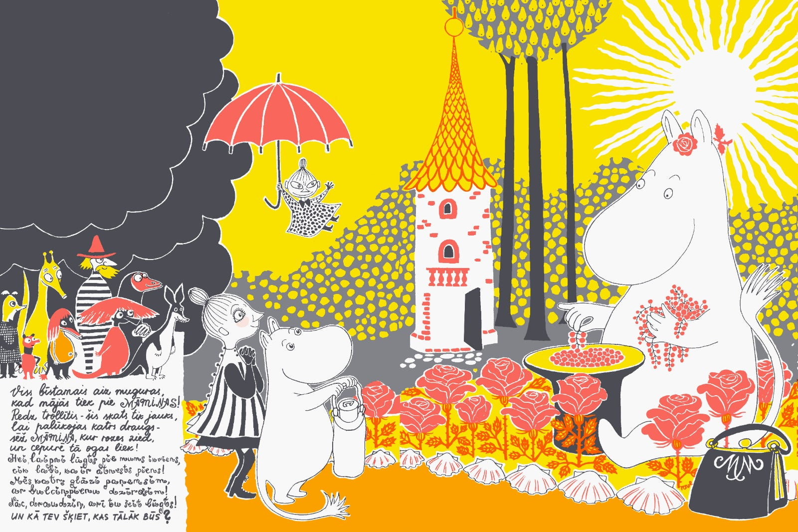 Īpaši interesants ir grāmatas dizains – tajā svarīga loma ir katram mākslinieces zīmētajam burtam, kas kļūst par ilustrācijas sastāvdaļu. Burti atbilst varoņu raksturam – piemēram, Muminu māmiņas vārda burti izskatās piemīlīgi un sievišķīgi, bet mazās Mijas burti – mazi un spītīgi. Burtu lielums un izkārtojums palīdz sekot notikumiem, burti satraucas, bēg, laimīgi izglābjas tāpat kā stāsta varoņi. Latviešu valodā šo Jānsones burtu pasauli, kurā nekas nav nejaušs, bet rūpīgi izdomāts, atveidojusi māksliniece Ūna Laukmane. Grāmatu no zviedru valodas tulkojusi Mudīte Treimane, atdzejojusi Inese Zandere.