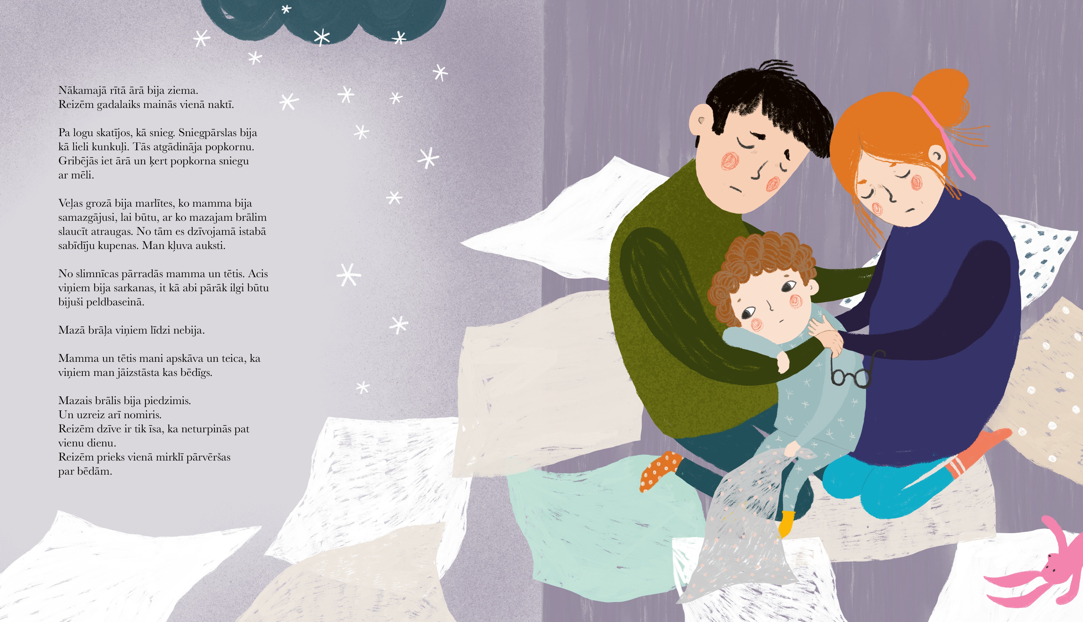 Bēdas par bērna zaudējumu ir skārušas gan somu rakstnieci Annu Elinu Isoaru, gan mākslinieci Miru Malliusu. Grāmatā viņas sniedz mierinājumu ģimenēm,kas pieredzējušas to pašu, un atklāj līdzjūtības spēku.
