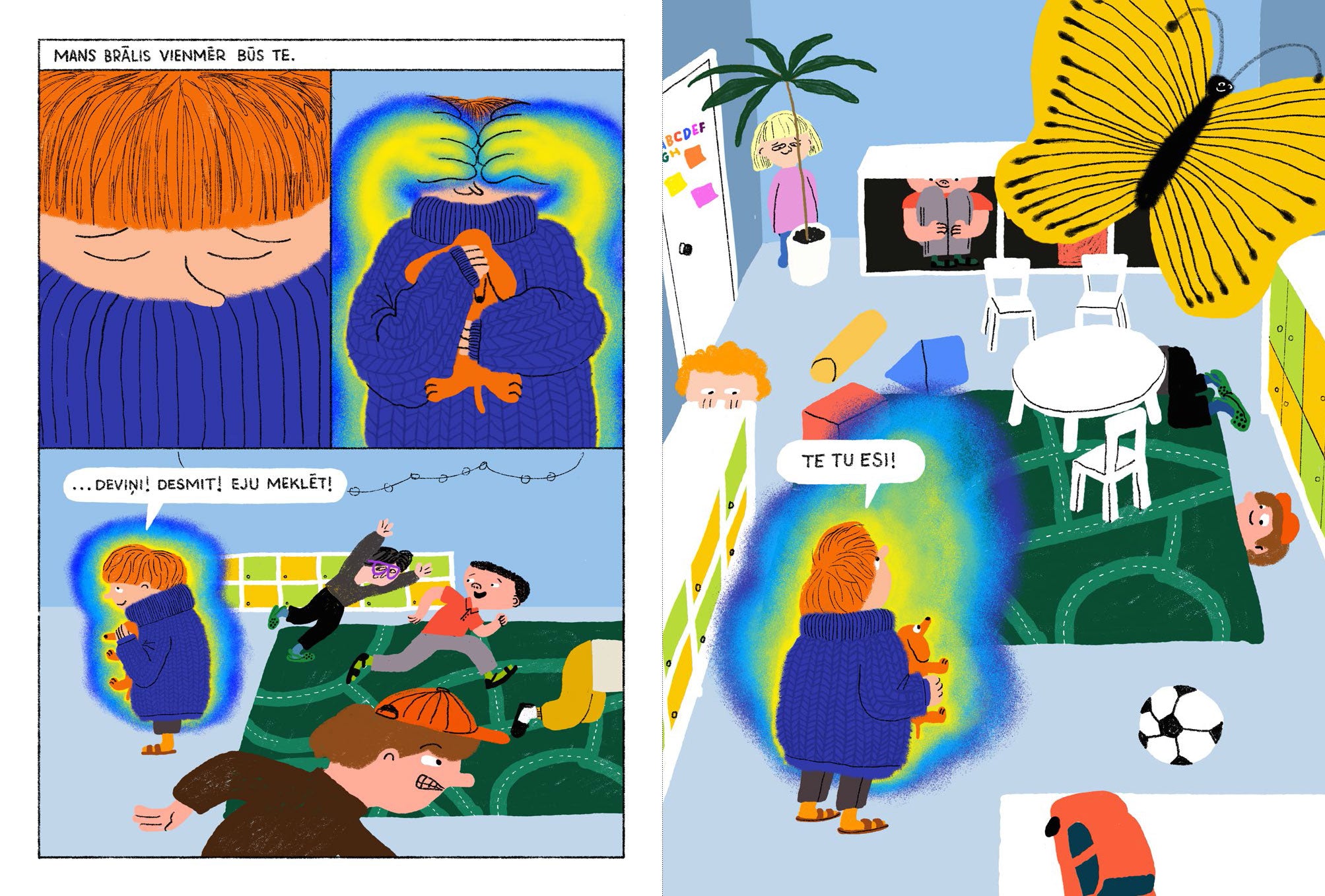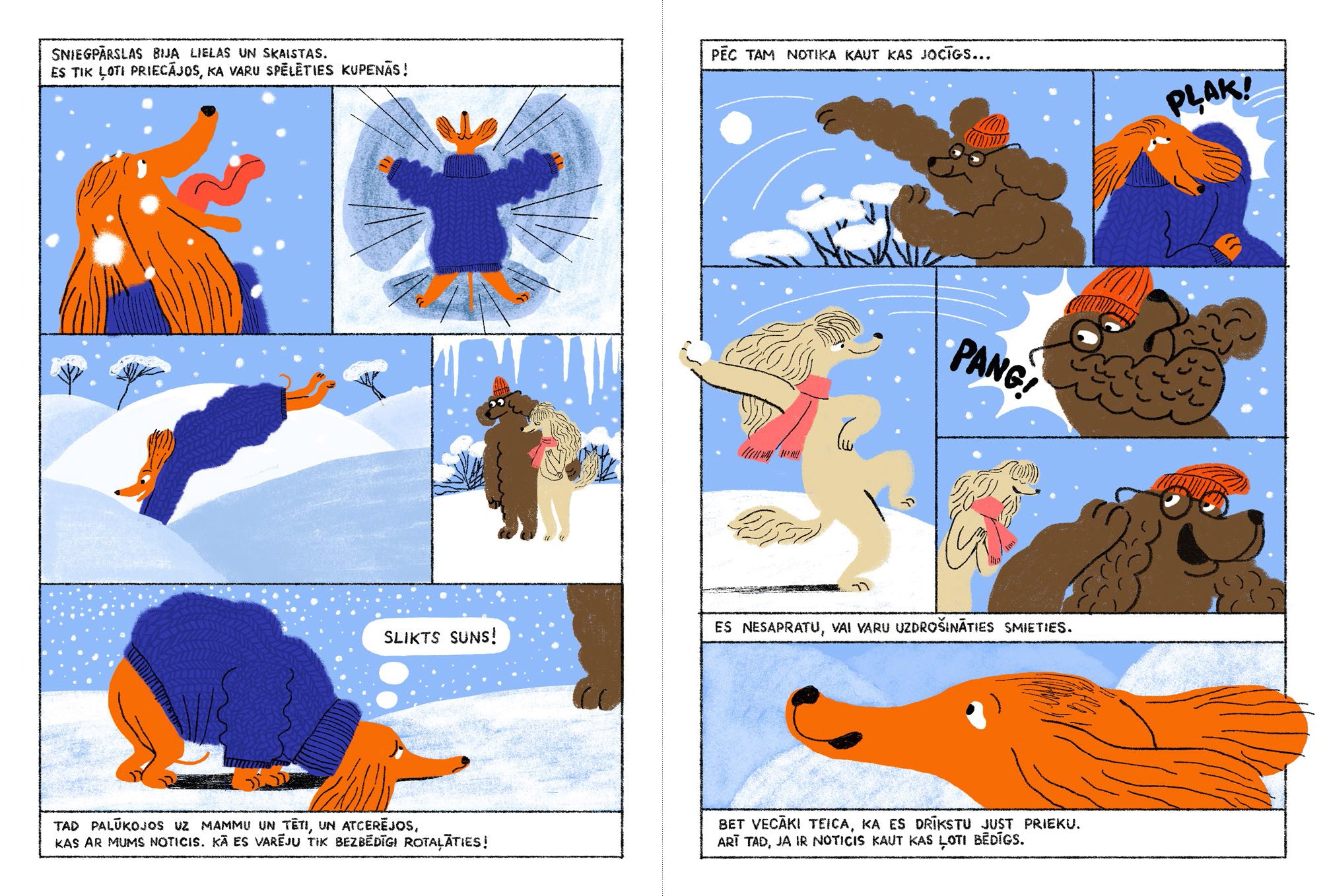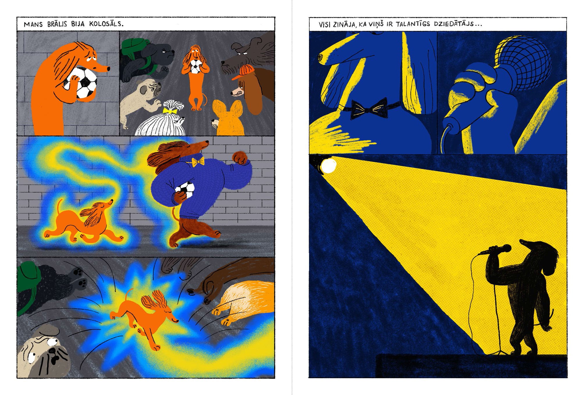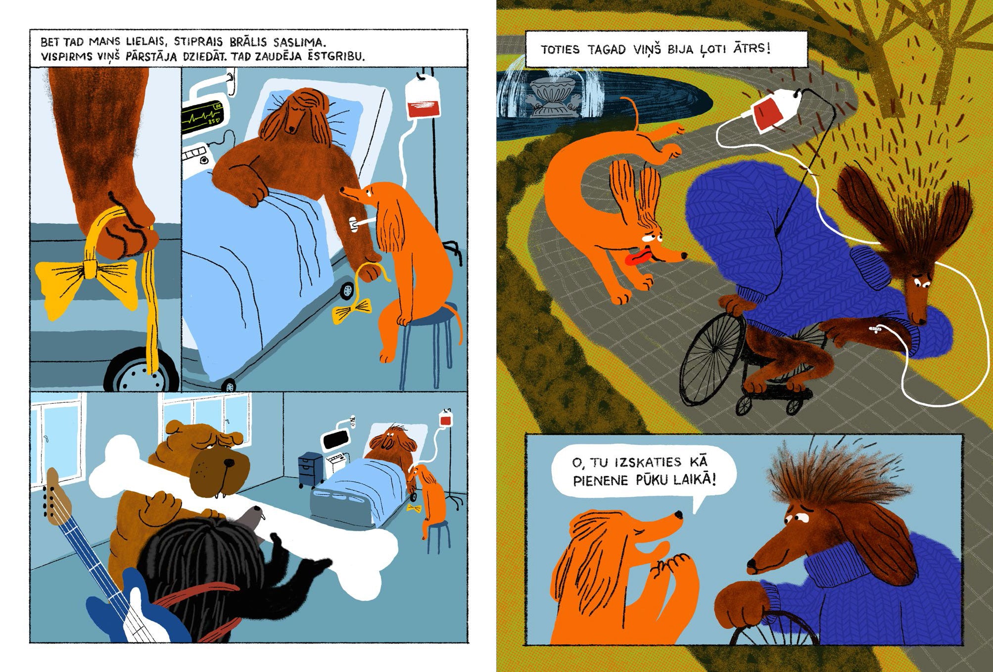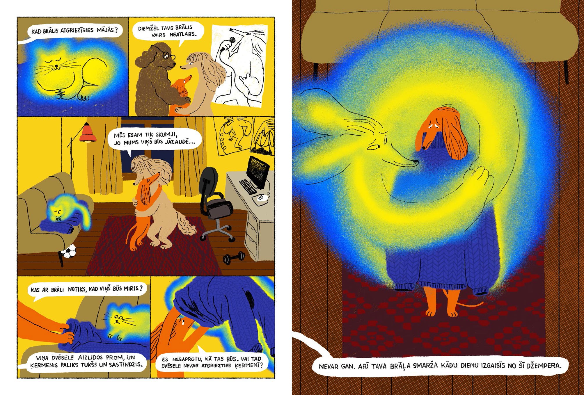 Grāmata seko ģimenei, kas piedzīvo vecākā brāļa nāvi, skatot to no jaunākā bērna perspektīvas. Siltās un izteiksmīgās ilustrācijas atklāj bērna iekšējo pasauli, pilnu rotaļīguma un drosmes, bet arī klusu, neizteiktu emociju. Tas ir stāsts par zaudējumu, atmiņām un to, kā pasaule mainās, bet tomēr nezaudē savas krāsas. Aizstājot cilvēkus ar suņu ģimenes tēliem, autori pārvērš stāstu jutīgā un vizuāli izteiksmīgā naratīvā.
