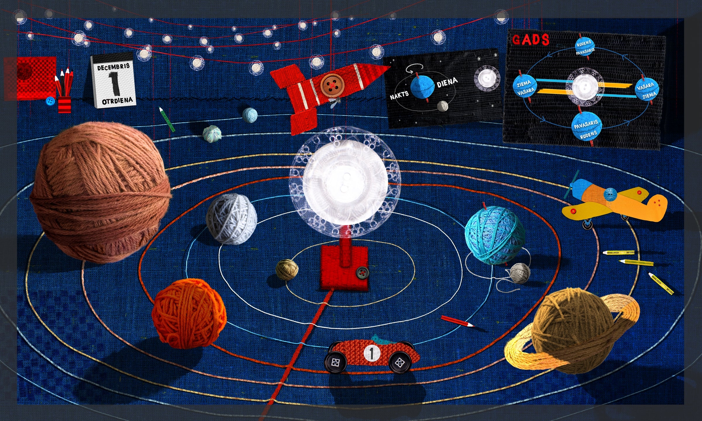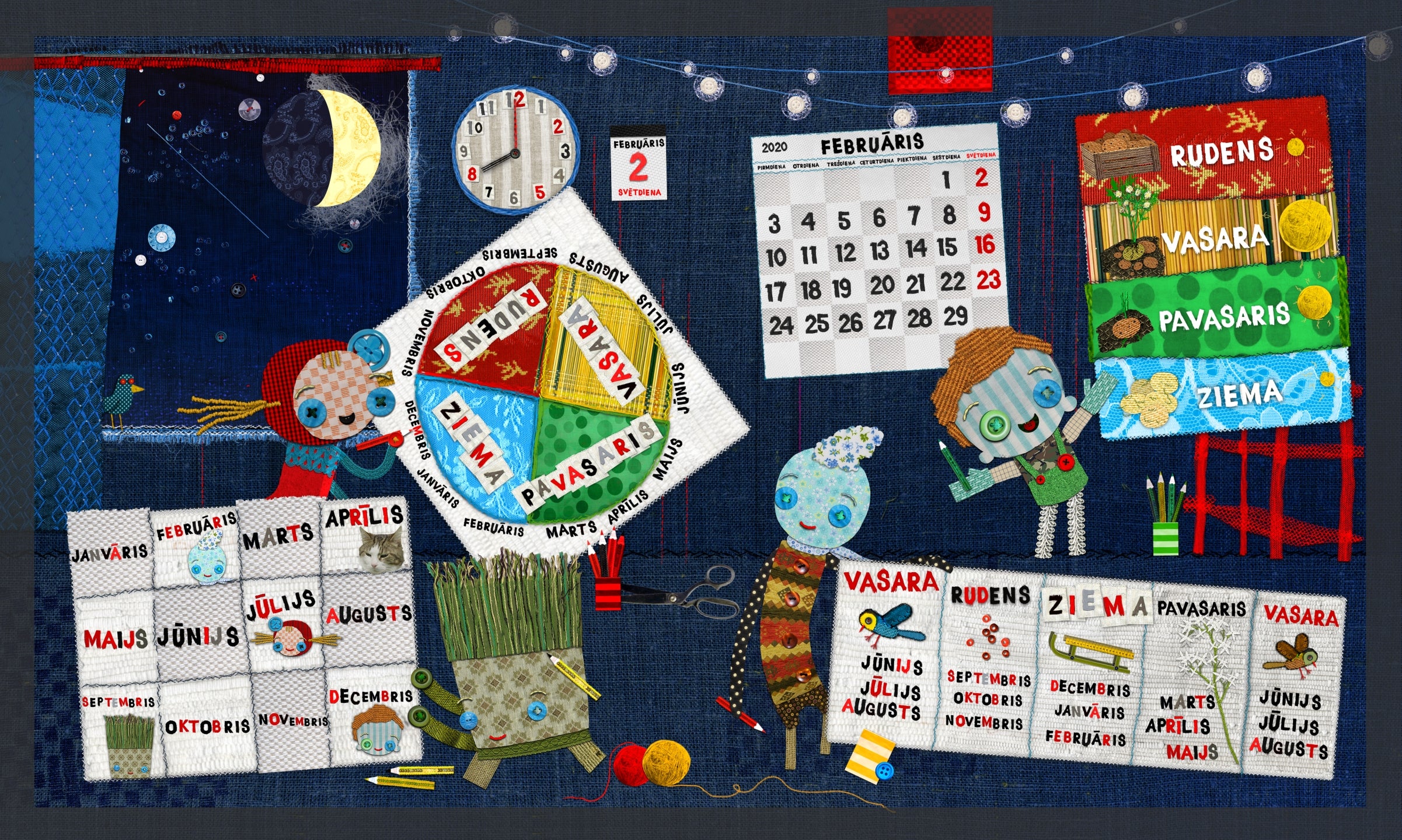 Sērijas piektajā grāmatā Lupatiņi seko gadalaikiem un dabas parādībām, mācās noteikt diennakts laiku. Mazais lasītājs iepazīstas ar pulksteni un kalendāru un uzzina, kāda ir saules loma gadalaiku maiņā. Šī grāmata ir piemērota 5–9 gadus veciem bērniem, kā arī nedaudz jaunākiem.