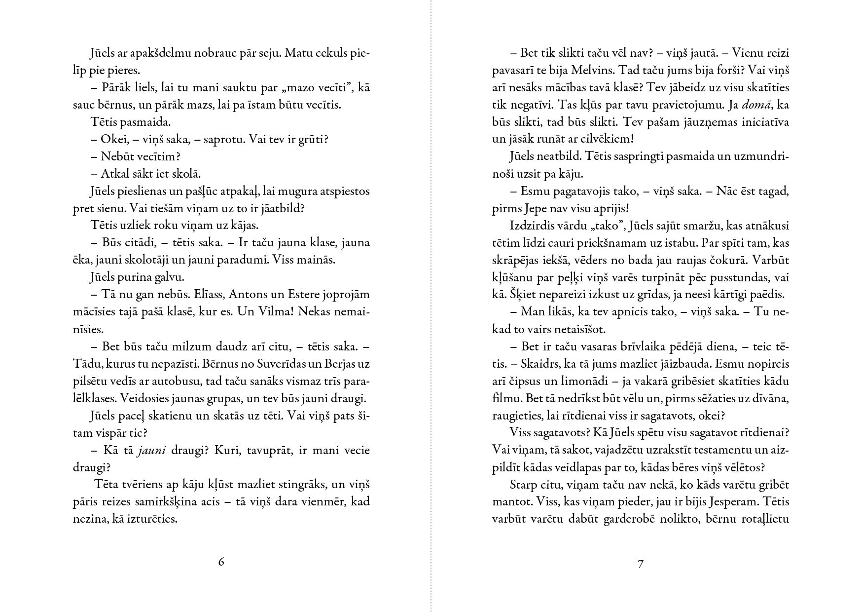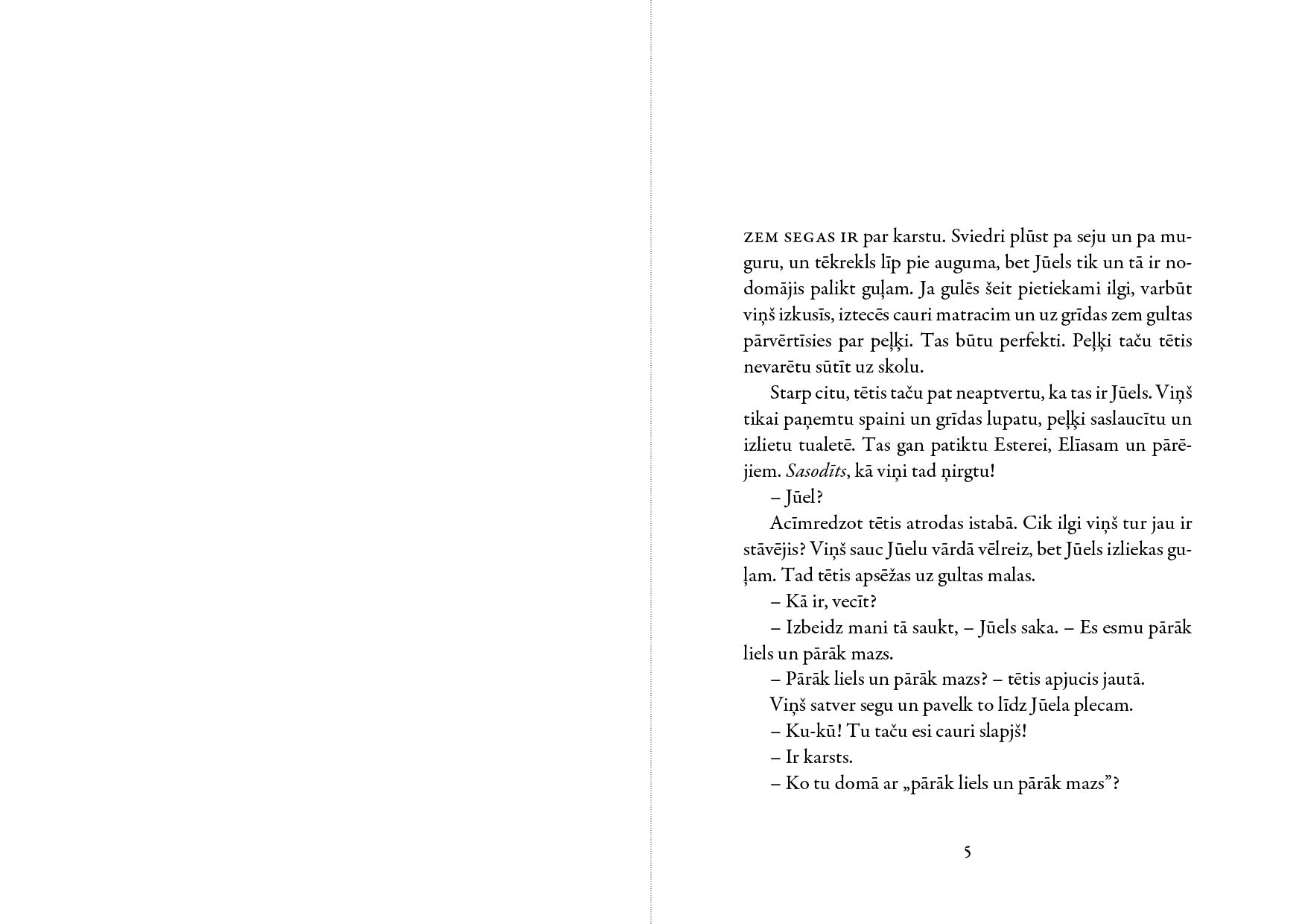 Jūels bija cerējis, ka 6. klasē būs citādi, bet viss ir tāpat kā bijis. Viņam jāturpina spiesties gar sienām, jāturpina izlikties neredzamam. Lai tiktu prom no viņiem – mobingotājiem. Ar Esteri priekšgalā – meiteni ar asu skatienu un platīnblondiem matiem. Ļaunāko no viņiem visiem. Kādā vēlā vakarā Jūela un Esteres ceļi nejauši krustojas, un viņu dzīve mainās. Slepenībā varmāka un upuris var stāstīt viens otram to, ko nav stāstījuši nevienam citam. Visu to, kas citiem nav saskatāms. Šī grāmata ir spēcīgs stāsts par draudzību un izstumtību, par noslēpumiem un uzdrošināšanos būt pašam.